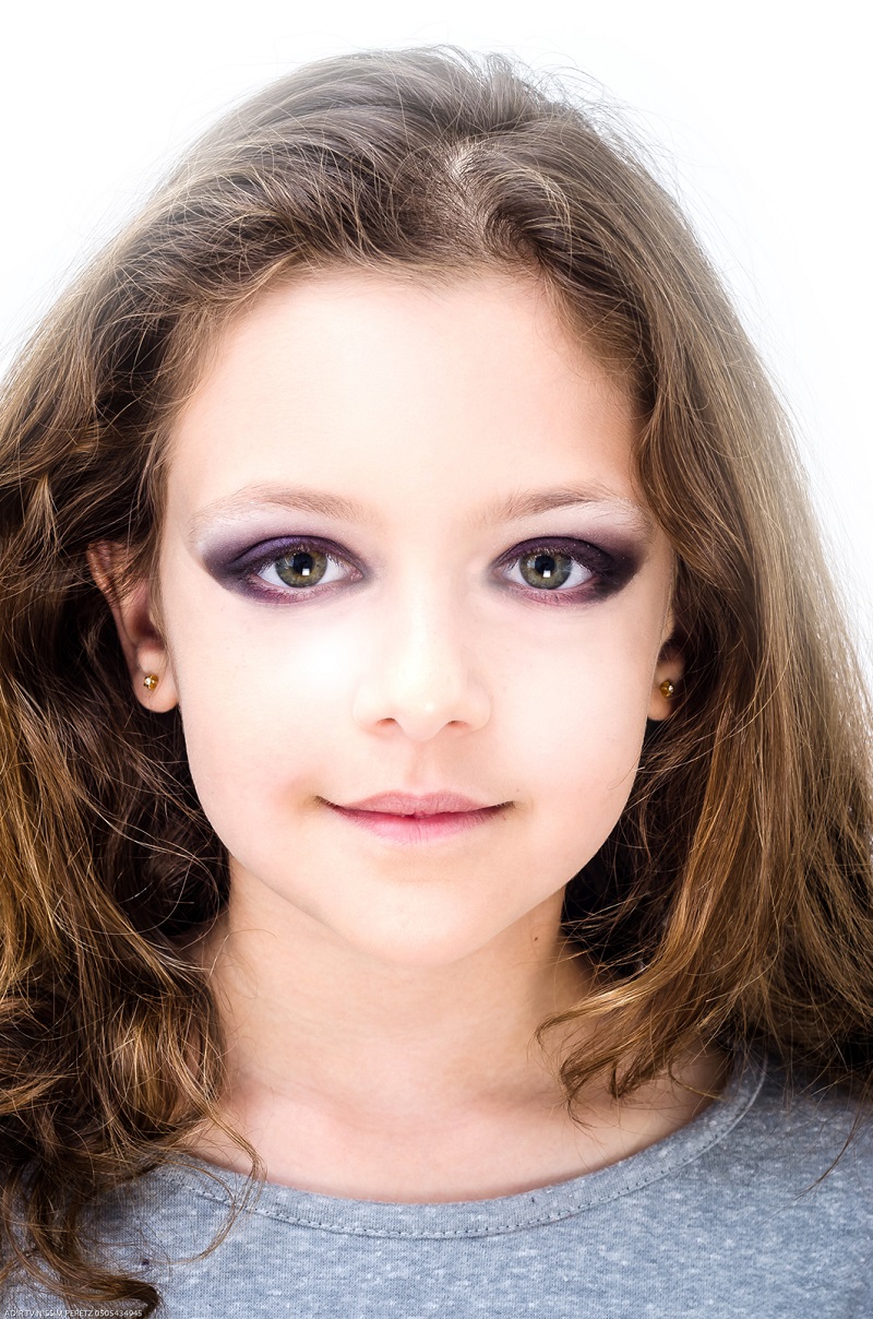 בעזרת צללית שחורה לתחום את העפעף העליון ולהדגיש את הזויות החיצונית של העין. היות ומדובר באיפור ילדים יש להעדיף תמרוקים באבקה ופחות כאלה המוצעים במרקם נוזלי. עם צללית סגולה נשלים את איפור העפעף ובפיגמנט שנותר על המברשת נוסיף ממנה גם בקו העפעף התחתון.