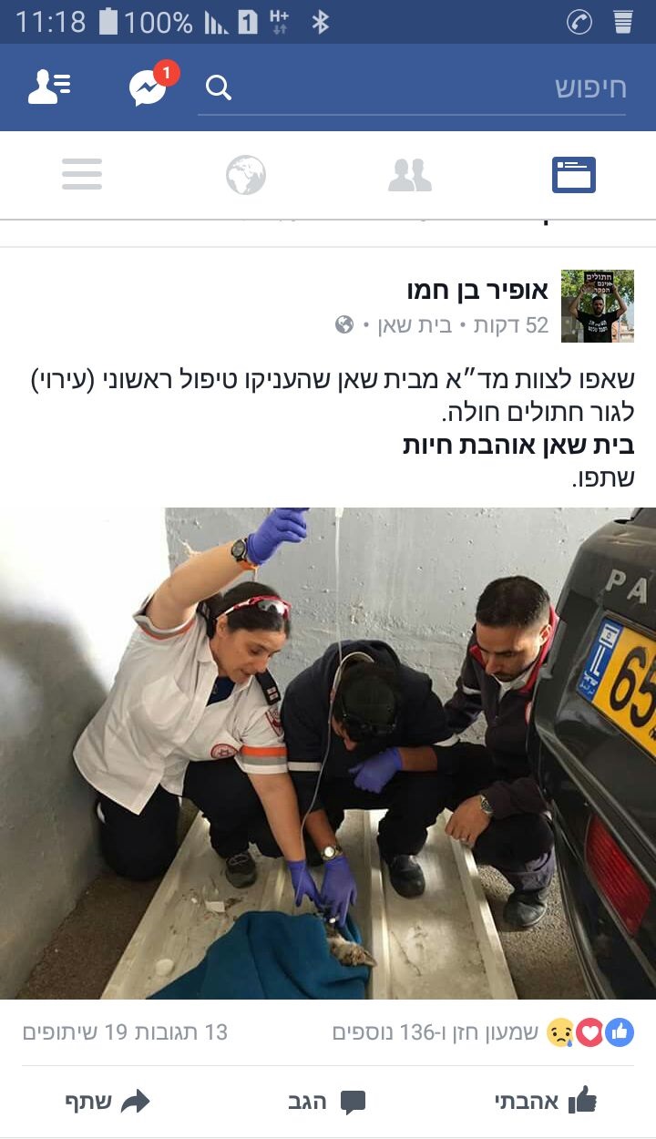 אופיר בן חמו, פעיל למען זכויות בעלי חיים, המוכר בבית שאן ככתובת בכל הנוגע לסיוע לחיות באזור, הגיע למקום ופינה את החתול לבית חולים וטרינרי, מדבריו, "קיבלתי טלפון מצוות מד"א בתחנה, מיד עזבתי הכל והגעתי לפנות את החתול לווטרינר".