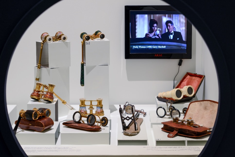 בין מאות הפריטים המוצגים: משקפיים מן המאה ה 17- ועד היום, סקיצות של עיצוב משקפיים מבית האופנה של פייר קרדן, שעוצבו על ידי אביו של קלוד, מסכות משובצות אבני חן שעוצבו על ידי בתי אופנה גדולים ושימשו בעיקר לתצוגות אופנה, המשקפיים הראשונים בעלי ידיות, מונוקלים, משקפות תיאטרון ומשקפי מספריים ששימשו את האריסטוקרטיה הפריזאית של המאה ה19-, משקפי אסקימוסים אותנטיים עשויים עצם, משקפי ג'ון לנון ואלטון ג'ון, משקפיים סיניים מתקפלים מהמאה ה-17, משקפיים עשויים שריון צב ועוד.
