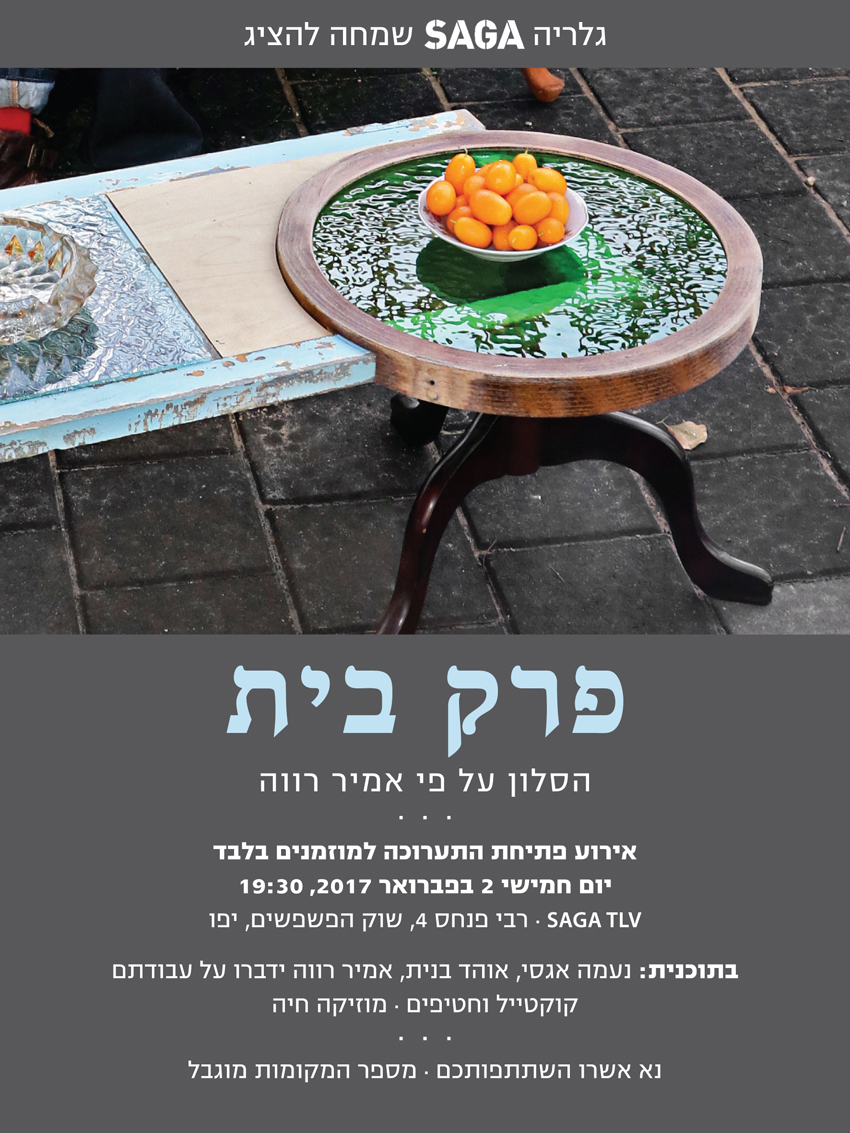תערוכת מכירה של המעצב אמיר רווה בגלריה סאגה, רבי פנחס 4, שוק הפשפשים, יפו. אירוע פתיחה: יום חמישי 12 בפברואר 2017, 19:30 . שעות פעילות: א-ה 10:00-18:00 שישי 09:00-16:00 - נעילה: יום חמישי 23 בפברואר, 2017 - אוצר: ליאור ימין. ייצוג מעצבים: מיכל ויטל. אירוע הפתיחה מיועד למוזמנים בלבד, יש לאשר במייל doing@upcyclish.com