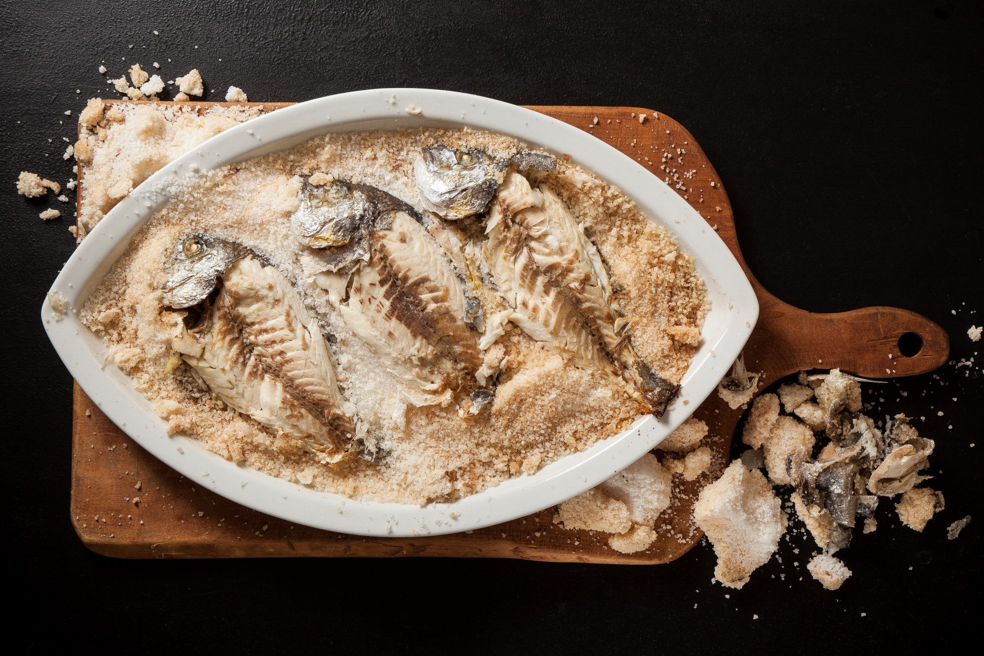מערבבים את המלח הגז עם החלבונים. מניחים שכבה דקה של מלח בתבנית, מניחים מעל את הדגים ומכסים ביתרת המלח. מהדקים מעט וצולים כ-30 דקות.