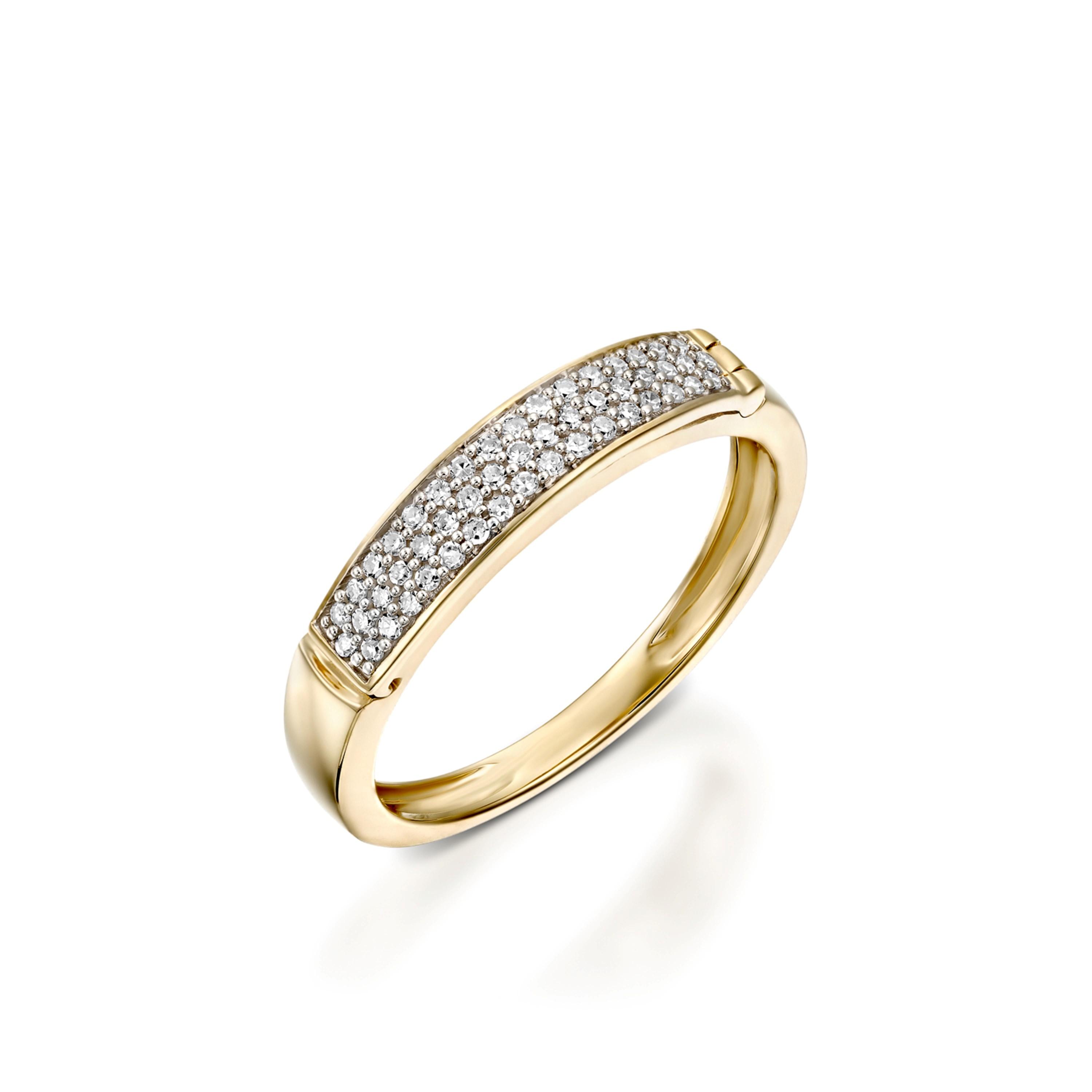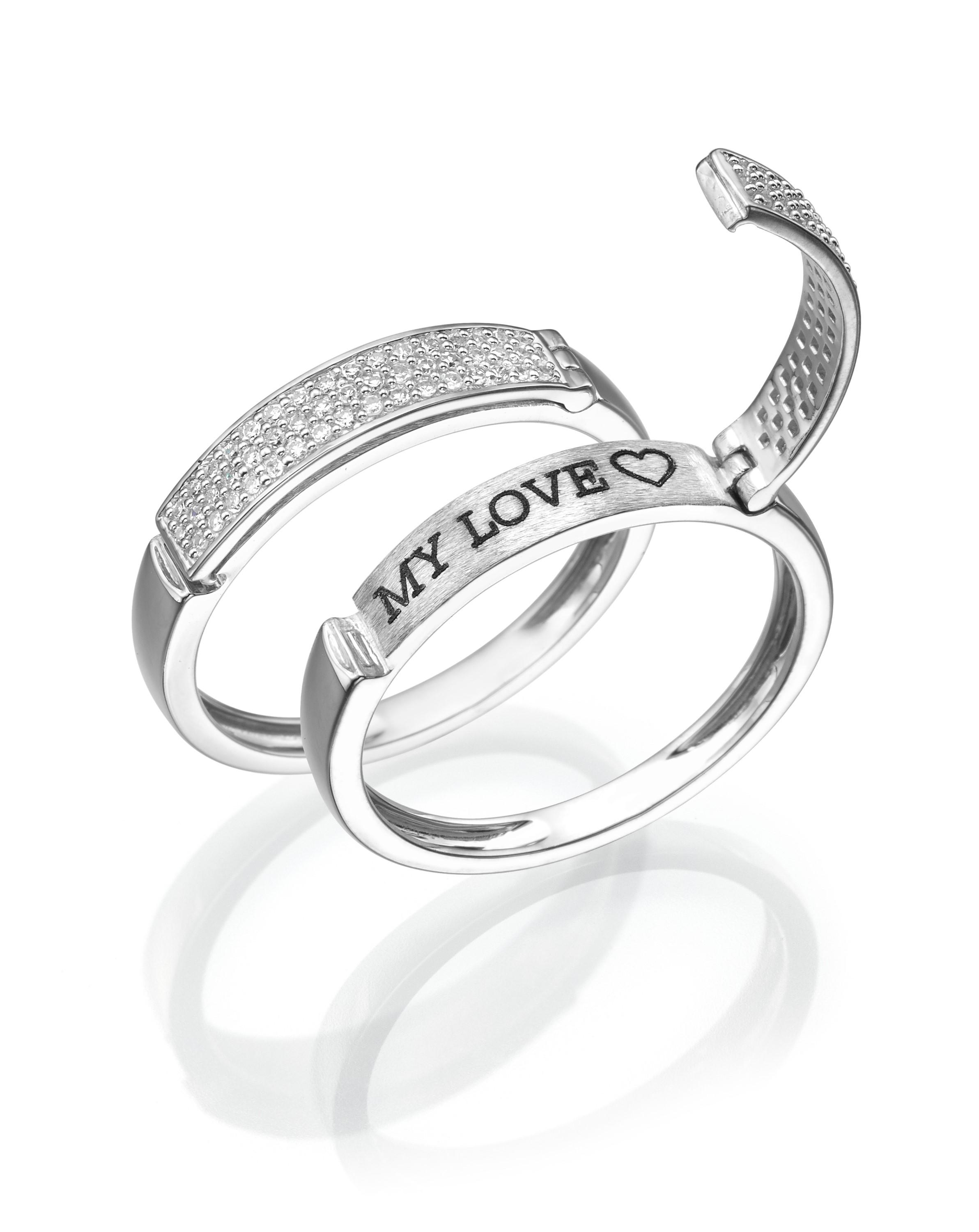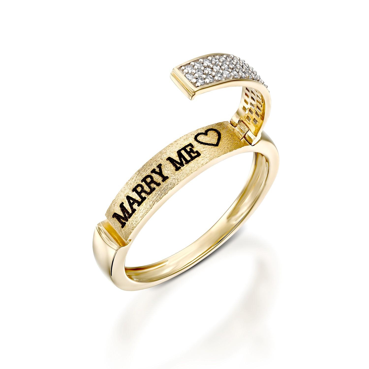 טבעת MARRY ME הינה עיצוב ייחודי ומיוחד של רשת Impress. הטבעת עשויה מזהב ומעוצבת בשני רבדים: רובד עליון משובץ יהלומים המעניק לטבעת מראה יוקרתי ומיוחד. שורת היהלומים נפתחת ומתחתיה מופיע סוד ההקדשה עם חריטה של המילים MARRY ME המהוות את הצעת הנישואין.