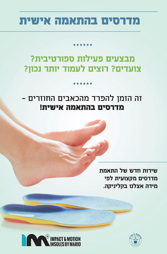מרפאת "ביאליק"- מרפאת כאב להקלה בכאבי רגלים וגב, בשיתוף Impact & Motion Insoles מציעים לכם שירות חדש של התאמת מדרסים לפי מידה אישית! שביעות רצון מובטחת, ליווי לאורך כל התקופה והסתגלות הרגל למדרס- הכול במקום אחד. אז אם אתם מעוניינים למנוע כאב, לטפל בו או פשוט לשפר את איכות החיים שלכם- אנחנו כאן לשירותכםJ